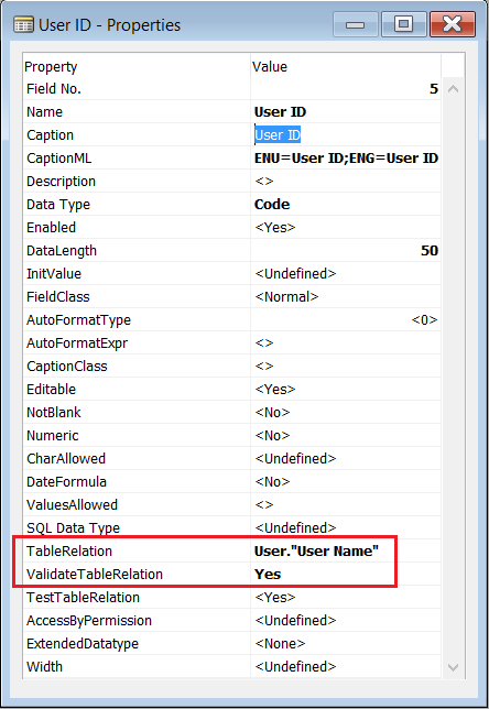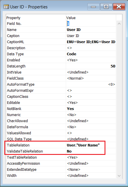 As you can see in the image above, the ValidateTableRelation Property has been set to “No”. This allows the user to enter any value in the field without NAV validating that the record exists in the related table, which will avoid the error, but still allow the user to lookup the User ID in the User table.